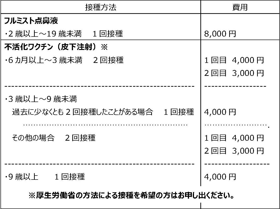 日本の厚生労働省は不活化ワクチン(皮下接種)については 13歳未満接種回数2回、13歳以上1回としていますが、米国CDC (米国疾病予防管理センター)1) では、9歳以上は1回接種、9歳未満の方で過去に2回接種した方は1回、それ以外の方は2回となっています。当院ではこの方法をお勧めしたいと思います。